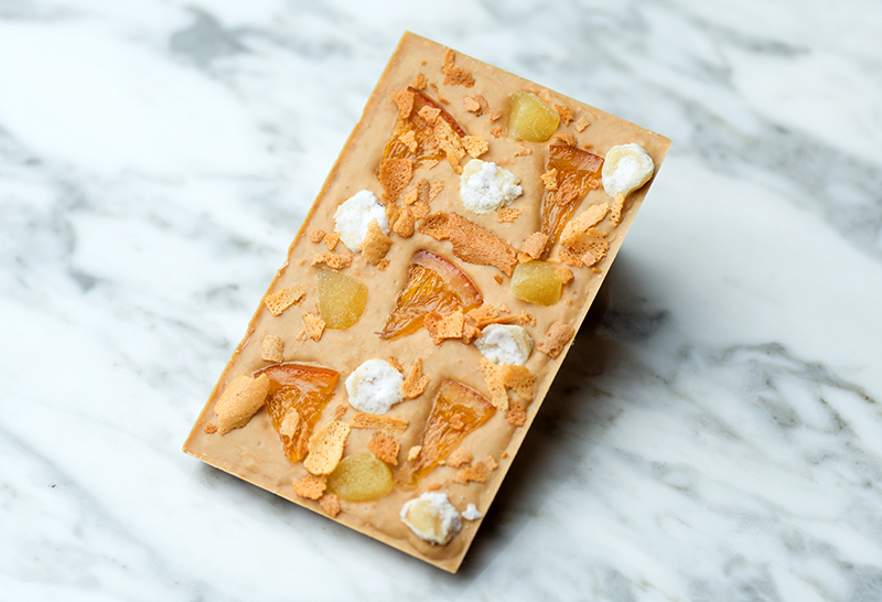 バニラが豊かに香るホワイトチョコレートに散りばめたのは、ピスタチオにサブレ、ほんのりビターなドライレモン、フランス・ゲランドの塩。ありそうでない素材の組み合わせで、新たな味わいの発見をお楽しみください。