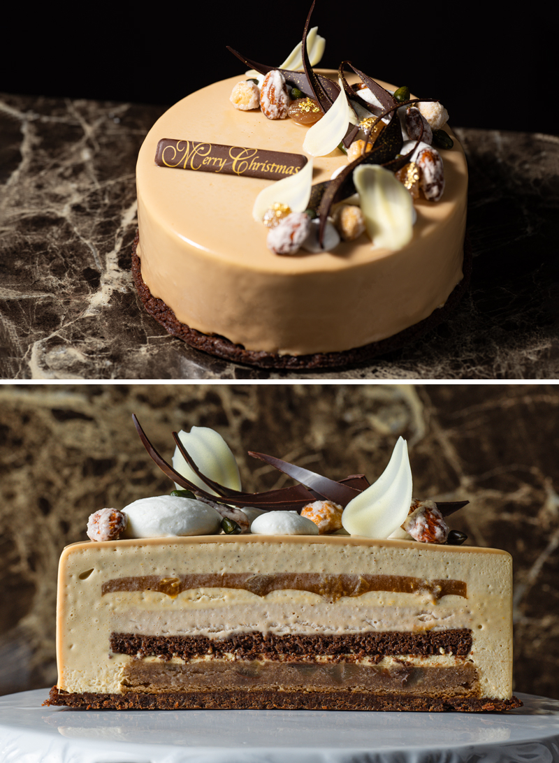 艶やかに輝くグラサージュ。ブロンドチョコレートの下にはバニラやショコラのムースに、ふんわりとラム酒の香るマロン。アクセントに甘酸っぱいアプリコットを重ねています。香ばしくローストしたナッツと合わせてお楽しみください。