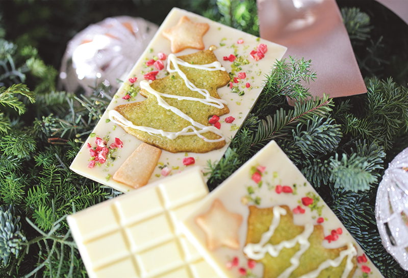 ホワイトチョコレートを使ったクリスマスシーズン限定のタブレット ショコラです。ピスタチオのサブレをツリーにしてデコレーションしました。